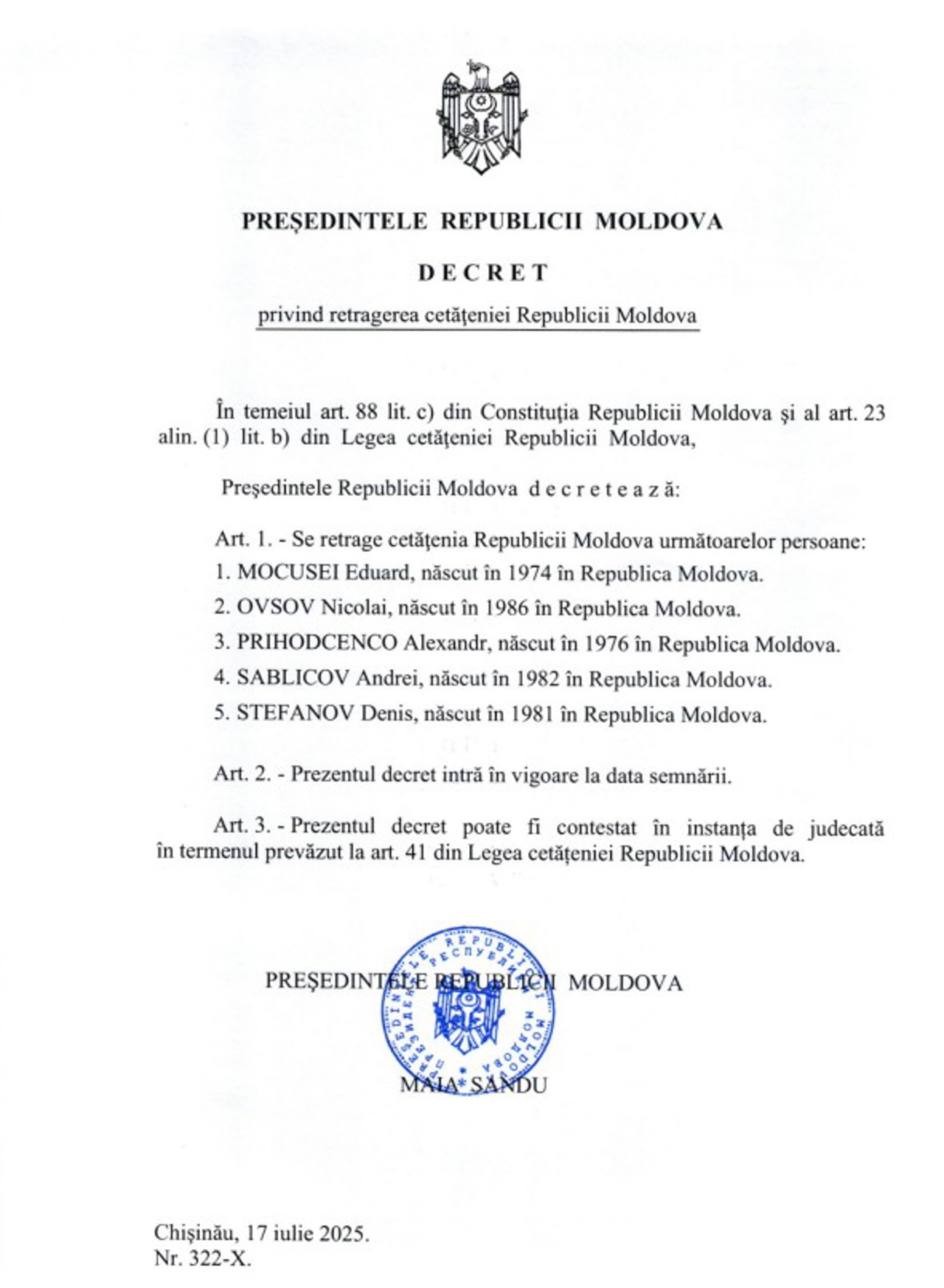 Președinta Maia Sandu a semnat un decret prin care retrage cetățenia moldovenească unui grup de cinci persoane, după ce s-a constatat că acestea s-au înrolat de bunăvoie în structuri militare ale altor state.